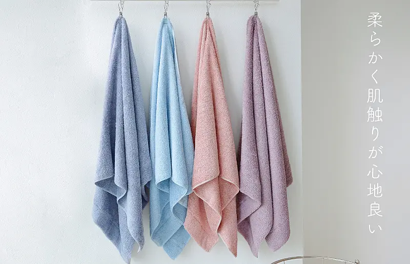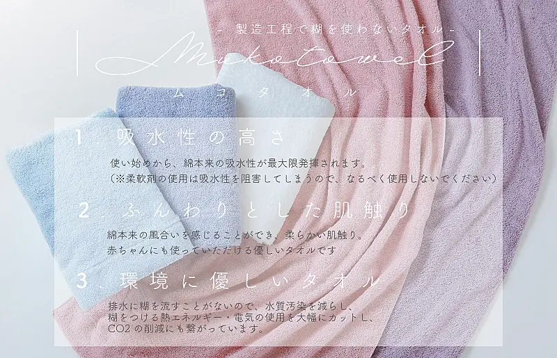 吸水性抜群の厚手タオルに加えて、製造・加工で糊を使わない「ムコタオル」×泉州タオル独自製法「後晒し製法」により使い始めから清潔で、綿本来の吸水性を最大限に発揮します。