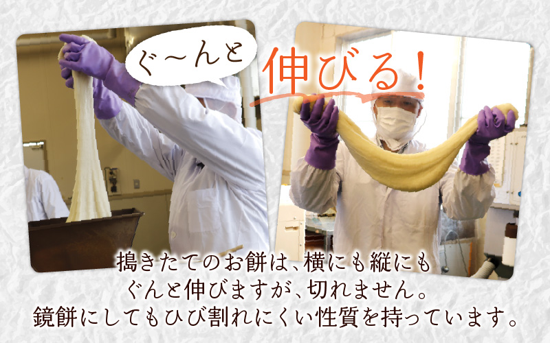 その為、搗きたてのお餅は、横にも縦にもぐんと伸びますが、切れません。鏡餅にしてもひび割れにくい性質を持っています。