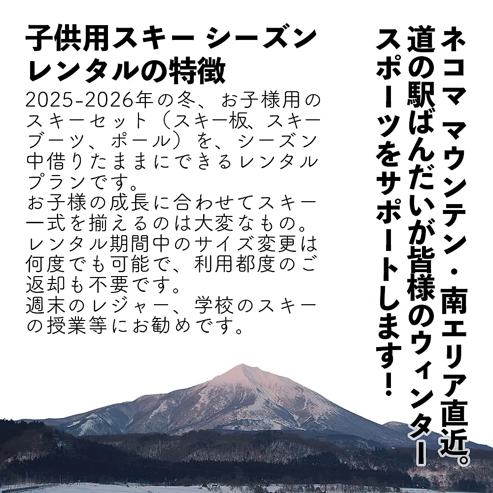 「子供用スキー シーズンレンタル」で、シーズン中は思う存分に週末のレジャー、学校のスキー授業や練習等にご利用ください。