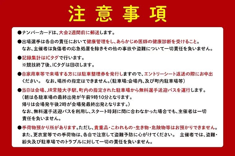 ・当日は会場、JR常陸大子駅、町内の指定された駐車場から無料選手送迎バスを運行します。(朝は各駐車場の最終出発が午前9時10分となります。帰りは会場発午後2時が会場発最終出発となります。)なお、無料選手送迎バスを利用し、スタート時刻に間に合わなかった場合でも、主催者は一切責任を負いません。