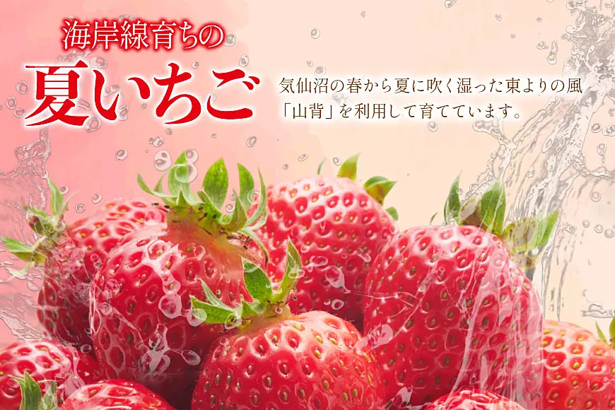 気仙沼の春から夏に吹く湿った東よりの風「山背」を利用した、海岸線育ちの夏いちごです。