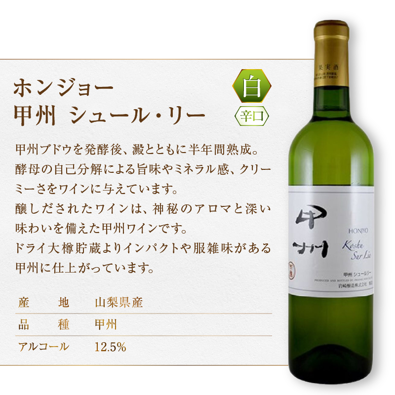 特徴:甲州ブドウを発酵後、澱とともに半年間熟成。酵母の自己分解による旨味やミネラル感、クリーミーさをワインに与えています。ドライ大樽貯蔵よりインパクトや複雑味がある甲州に仕上がっています。