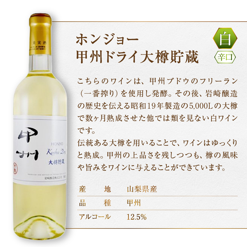 特徴:甲州ブドウのフリーラン果汁(一番搾り)を使用し発酵。その後岩崎醸造の歴史を伝える昭和19年製造の5,000Lの大樽で数か月間熟成させた、他では類を見ない白ワイン。伝統ある大樽を用いることで、ワインはゆっくりと熟成。甲州の上品さを残しつつも、樽の風味や旨味をワインに与えることができています。