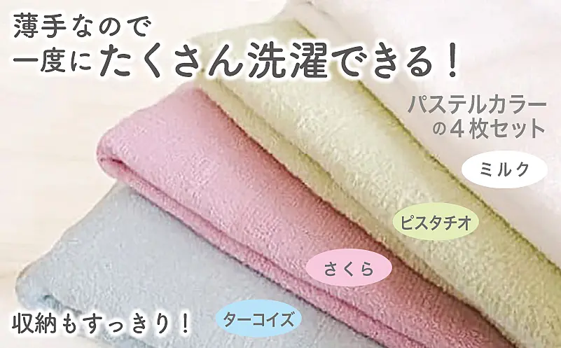 - ・バスタオル4枚(ミルク、さくら、ターコイズ、ピスタチオ)