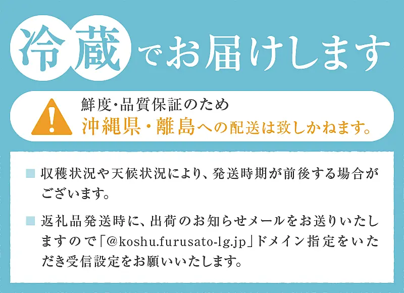 ・返礼品発送時に、出荷のお知らせメールをお送りいたしますので「@koshu.furusato-lg.jp」ドメイン指定をいただき受信設定をお願いいたします。