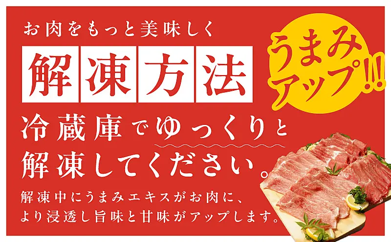 冷蔵庫でゆっくりと解凍してください。解凍中にうまみエキスがお肉に、より浸透し旨味と甘味がアップします。