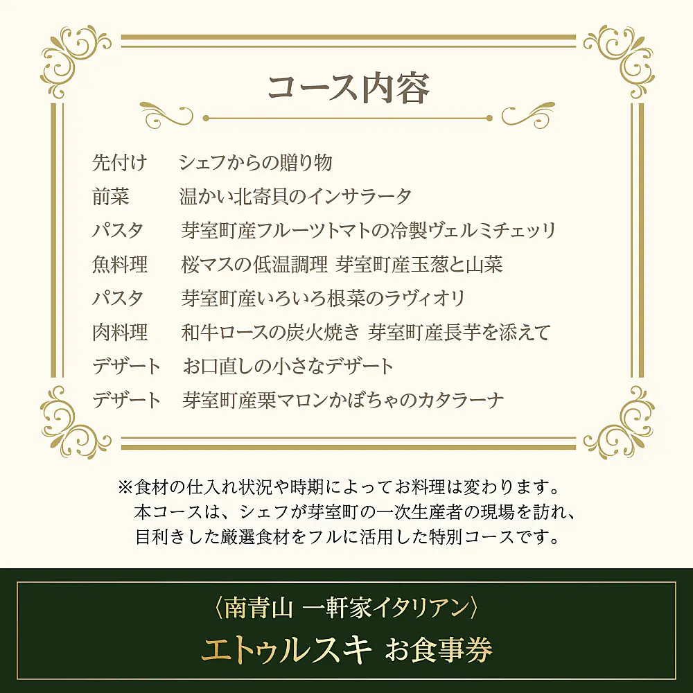 - 【南青山 一軒家イタリアン】エトゥルスキ 【芽室町特産品コース】食事券1名様分 ※2名以上で利用可