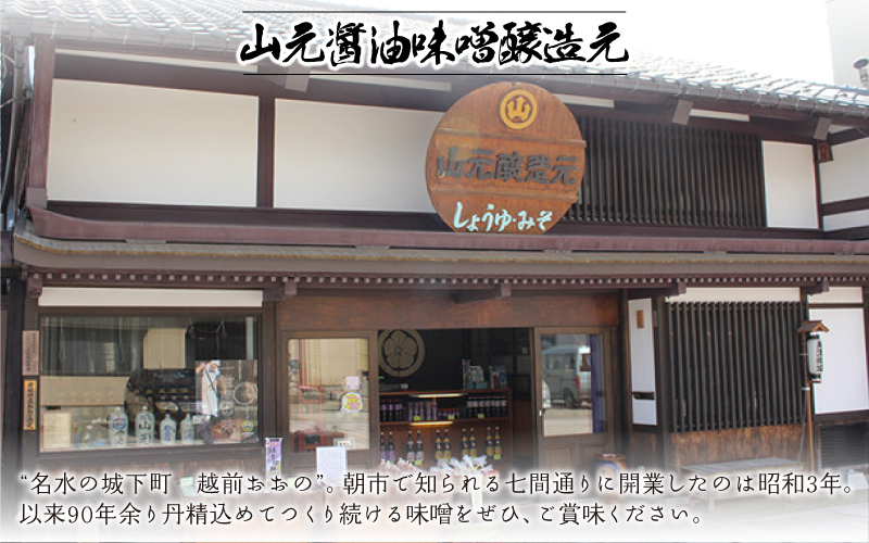 山元醤油味噌醸造元は、発酵食品の町、福井県大野市で "天空の城"として注目されている大野城の城下町で醤油作りを90年続けております。 90年間、昔から変わらない味へのこだわりを持ち、近隣住人の方や城下町散策にいらした観光のお客様にも御贔屓いただいております。