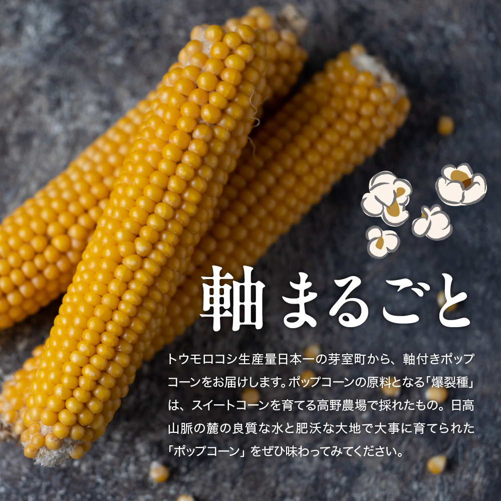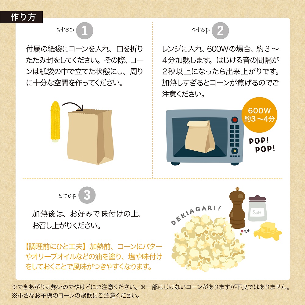1本まるごと同梱の電子レンジ対応特殊袋に入れて加熱しますと、袋の中で弾けてポップコーンになる様子をお楽しみいただけます。