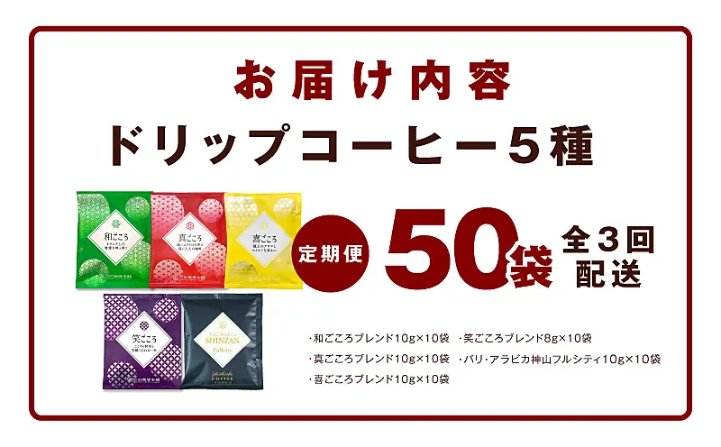 099Z148 ドリップコーヒー 5種 50袋 定期便 全3回 飲み比べセット【毎月配送コース】