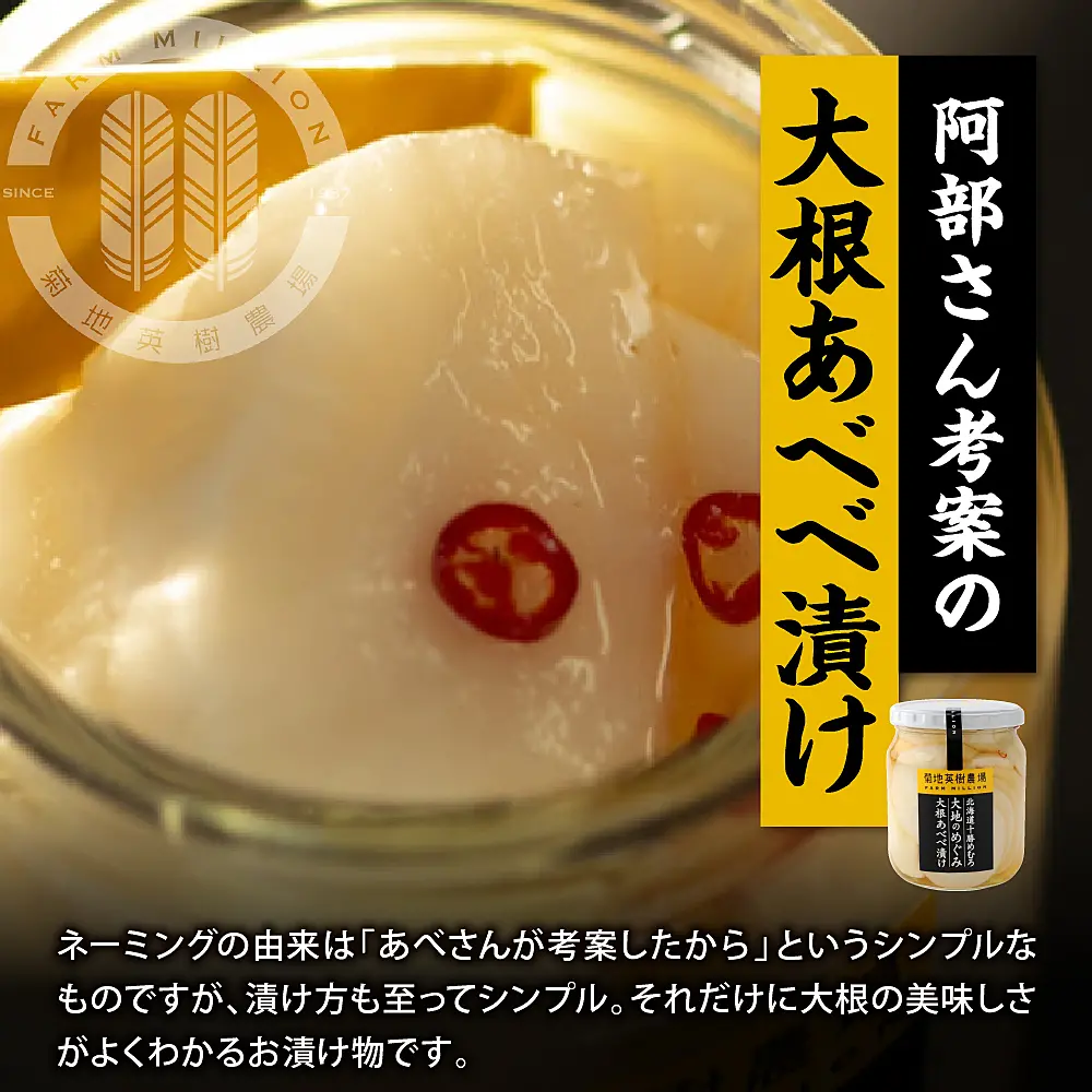 「あべべ漬け」は、ザラ目、塩、唐辛子、昆布を独自の配合で付け汁を仕上げ、新鮮な芽室産大根を使用して漬け込みます。出汁の旨みがいい塩梅の甘さを引き出し、鷹の爪がピリリと効いた、大人からお子様まで愉しんでいただけるご家庭のお漬け物です。