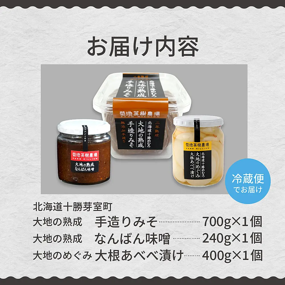 北海道十勝芽室町 大地の熟成 手造り味噌・なんばん味噌・大根あべべ漬け me016-007c
