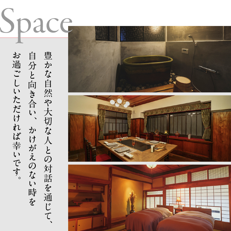 宿に入ると、アンティークのランプが優しく灯る上がりの間とクラシックな空気漂う書庫。お庭を横目に長い廊下をゆく先に、華やかなダイニングと続きの蔵が現れます。蔵は、1階に麻雀テーブルを配したプレイルーム、2階はシアターラウンジと、食後のひと時をゆったりお楽しみいただける大人の空間となっています。豊かな自然や大切な人との対話を通じて、自分と向き合い、かけがえのない時をお過ごしいただければ幸いです。