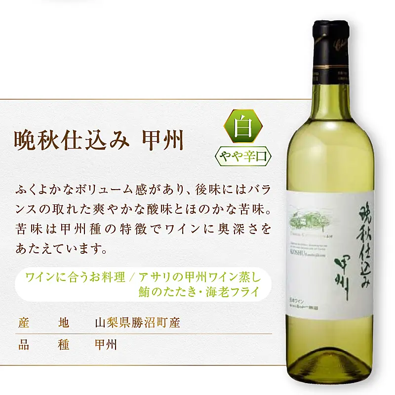 相性の良い料理:アサリの甲州ワイン蒸し、鮪のたたき、甲斐サーモンのロースト、海老フライ、信玄米でお野菜のリゾット、煮貝、ほうとう。
