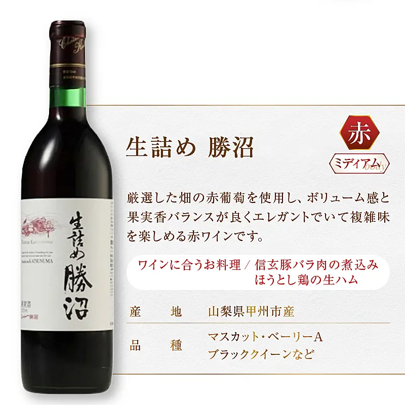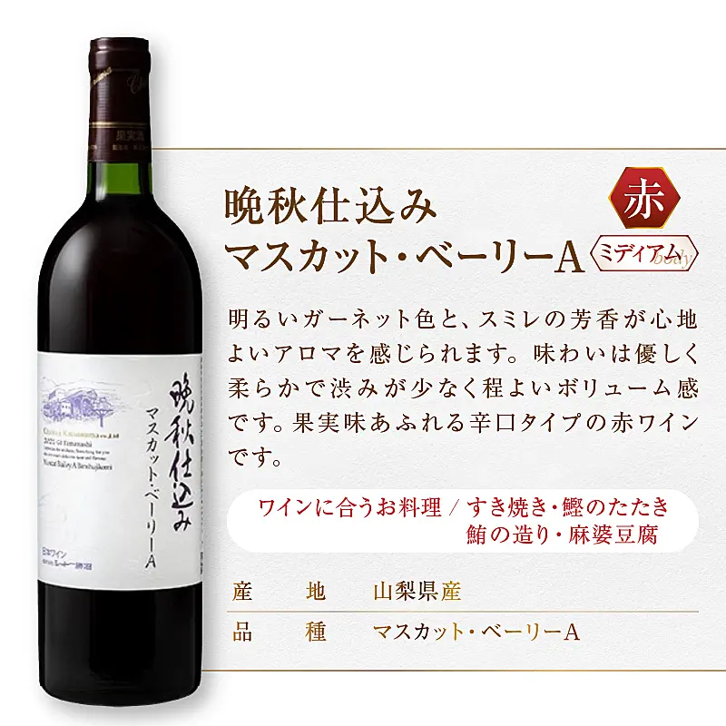 相性の良い料理:信玄豚バラ肉の煮込み、ほうとし鶏の生ハム、甲州地どりの卵でチーズオムレツ、ワインビーフで麻婆豆腐。