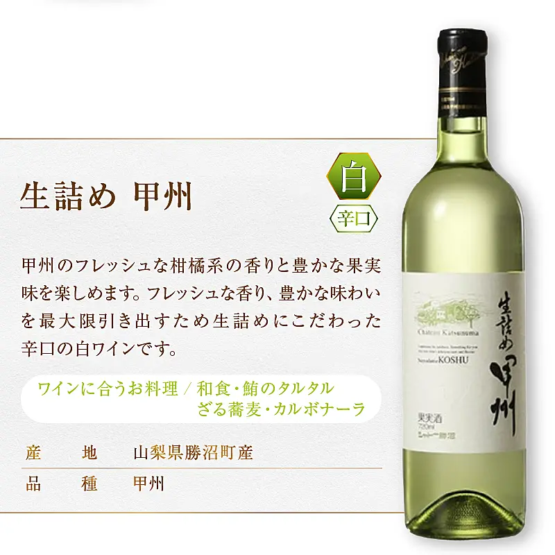 特徴:甲州のフレッシュな柑橘系の香りと豊かな果実味を楽しめます。フレッシュな香り、豊かな味わいを最大限引き出すため生詰めにこだわった辛口の白ワイン。