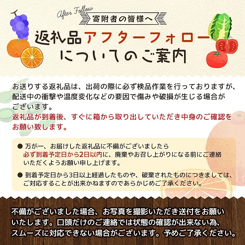 出荷の際検品後発送しておりますが、万一商品に問題がございましたら破棄やお召し上がりになる前にご連絡ください。