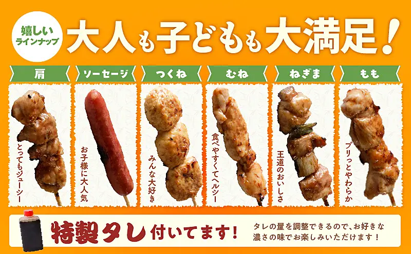 もも12本(約25g/本)、モモねぎま12本(約25g/本)、ムネ12本(約25g/本)、つくね12本(約40g/本)、ソーセージ12本(約25g/本)、肩12本(約25g/本)