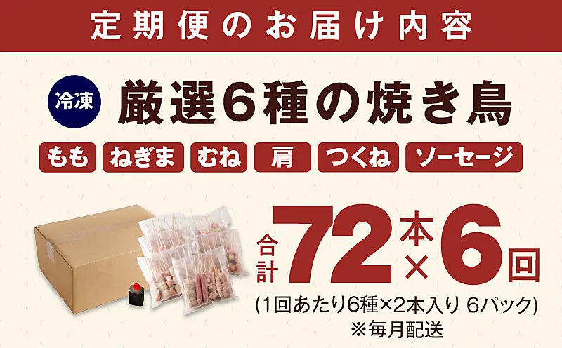 099Z379 焼き鳥 定期便 6種72本×全6回 やきとりのタレ付き 個包装 お楽しみ【毎月配送コース】