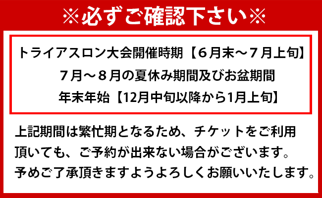※トライアスロン大会開催時期、7月~8月の夏休み期間及び盆時期、年末年始などの繁忙期は、予約状況によってはご利用できない場合がございます。
