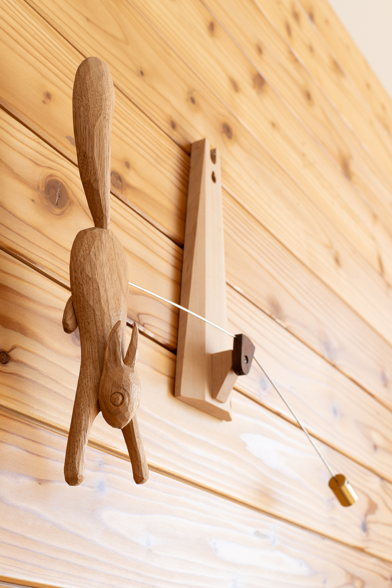 この作品は壁掛け式になっており、壁の前でバランスアームが回転し弧を描き、リスもアームの先で同様の動きをします。