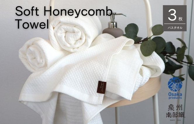 G1934 【ソフトハニカム】泉州南部織 バスタオル3枚セット(ホワイト)+ソフトハニカム織ハーフハンカチ1枚