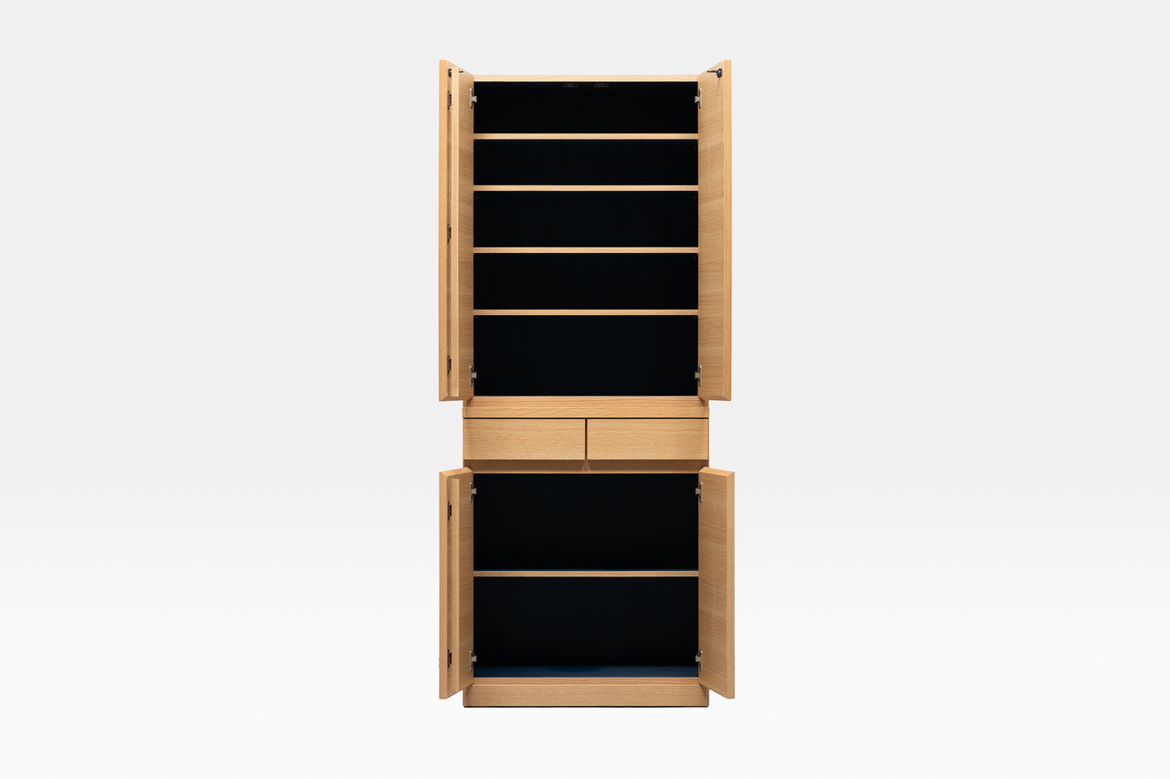 左右どちらからでも開閉できる扉の内部は、食器を美しく見せる印象的なインディゴブルー。上部の扉は耐震金物付きの安心設計です。