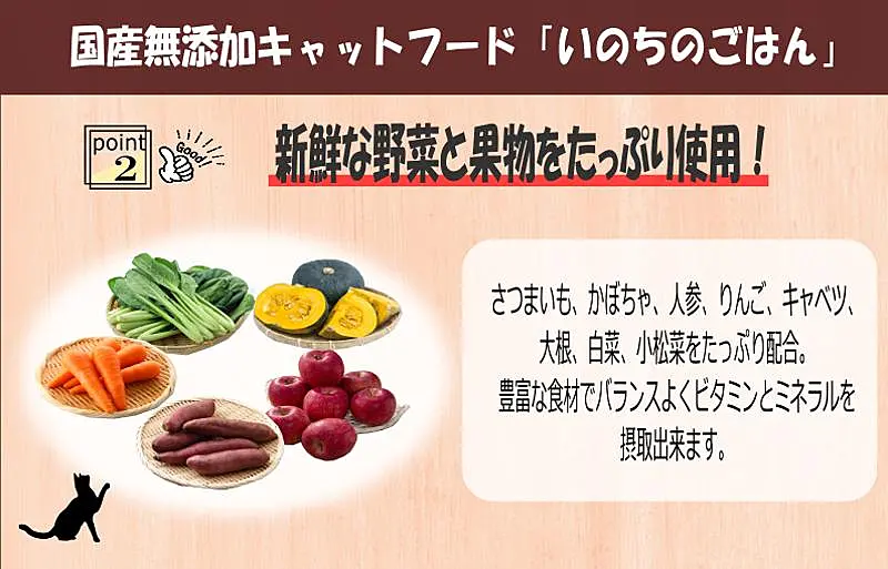 - 原材料:鶏生胸肉、生鶏レバー、五穀(大麦、もちきび、もちあわ、アマランサス、白ごま)、さつまいも、かぼちゃ、人参、りんご、キャベツ、大根、白菜、小松菜、コーンフラワー、米ぬか、おから、煮干し、昆布、椎茸、鰹節
