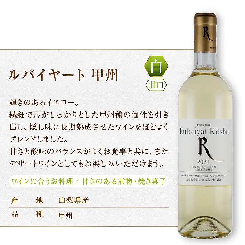 特徴:山梨県で栽培された甲州種を使用し醸造。繊細で芯がしっかりとした甲州種の個性を引き出し、隠し味に長期熟成させたワインを程よくブレンドしました。甘さと酸味のバランスが良く、食事と共に、またデザートワインとしてもお楽しみいただけます。
