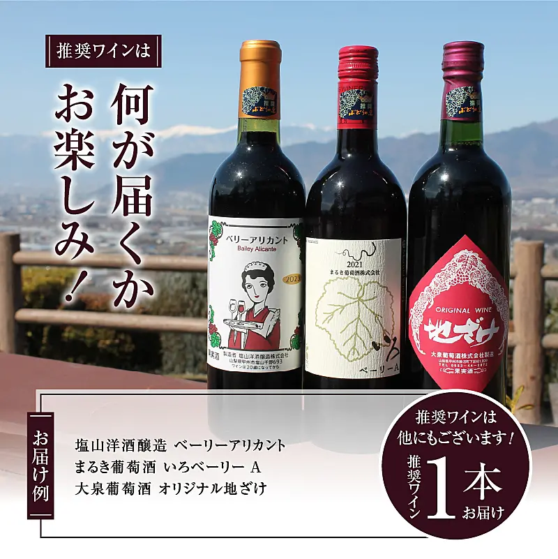 甲州市ワイン品質審査会を合格し、勝沼ぶどうの丘推奨となる選りすぐりの1本をご自宅でお楽しみください。
