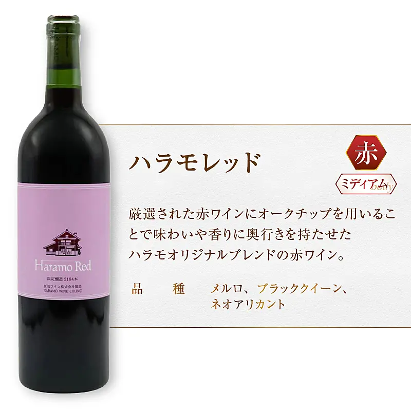 特徴:厳選された赤ワインにオークチップを用いることで味わいや香りに奥行きを持たせたハラモオリジナルブレンドの赤ワイン。