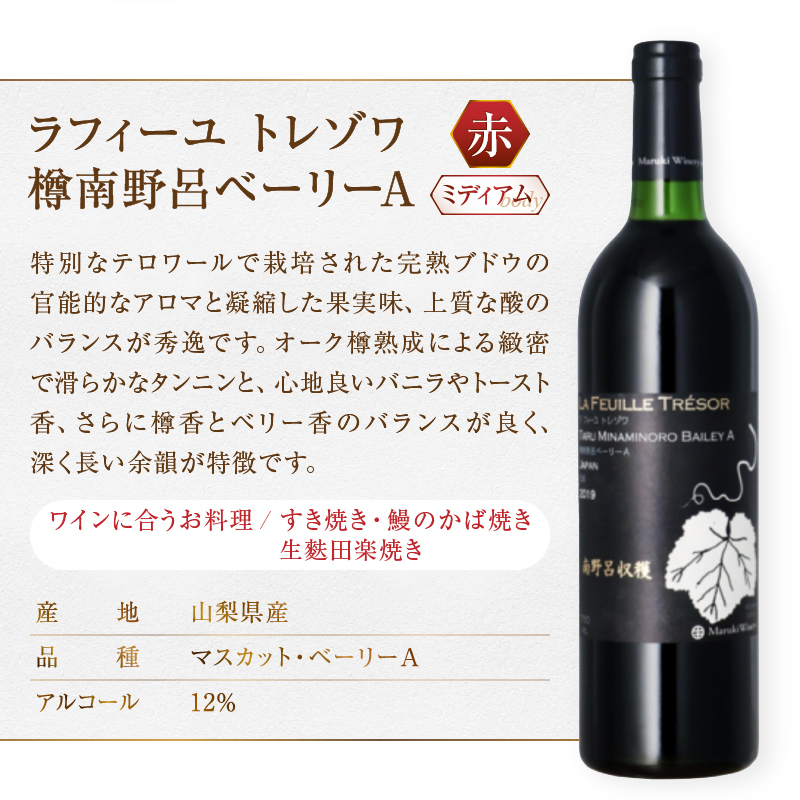 現存する日本最古のワイナリーまるき葡萄酒が贈るラフィーユトレゾワシリーズから『樽南野呂ベーリーA』と『リザーブド甲州』の赤白2本セットをお届けします。どちらも各ヴィンテージ様々な賞を受賞している優れたワインとして知られています。