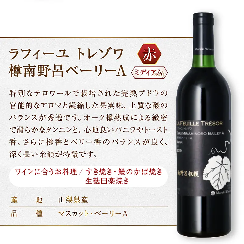 特徴:笛吹市南野呂地区の完熟マスカット・ベーリーAを使用。特別なテロワールで栽培された完熟ブドウの官能的なアロマと凝縮した果実味、上質な酸のバランスが秀逸。オーク樽熟成による緻密で滑らかなタンニンと、心地良いバニラやトースト香による深く長い余韻。全てが高い次元で融合したエレガンスな逸品。
