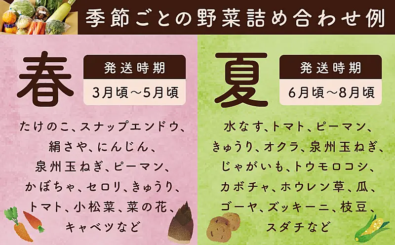 たけのこ、スナップエンドウ、絹さや、人参、泉州玉ねぎ、ピーマン、かぼちゃ、セロリ、きゅうり、トマト、小松菜、菜の花、キャベツなど