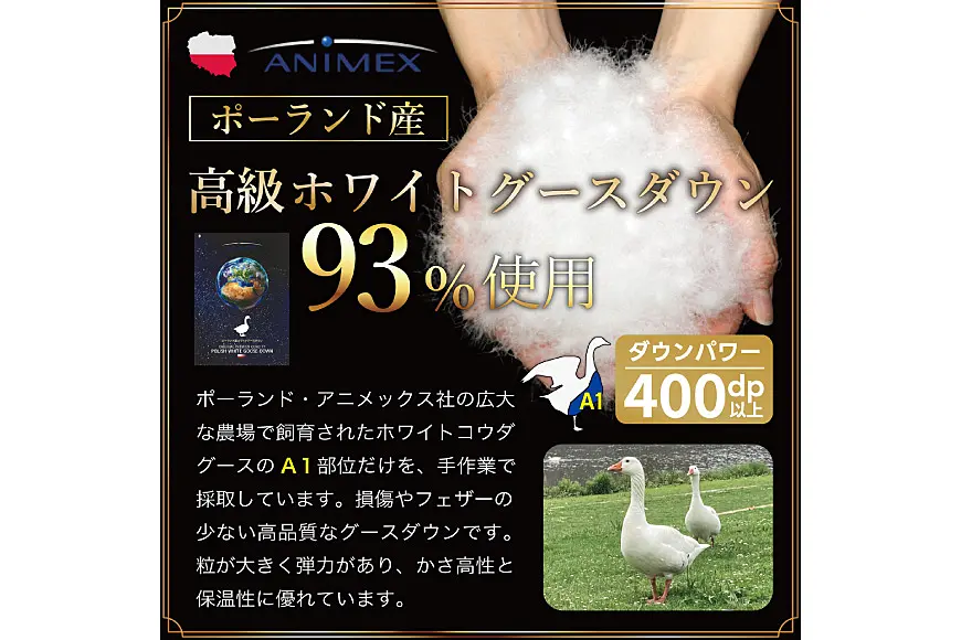 ポーランド羽毛を代表するアニメックス社のポーランド産ホワイトグースダウンを使用。