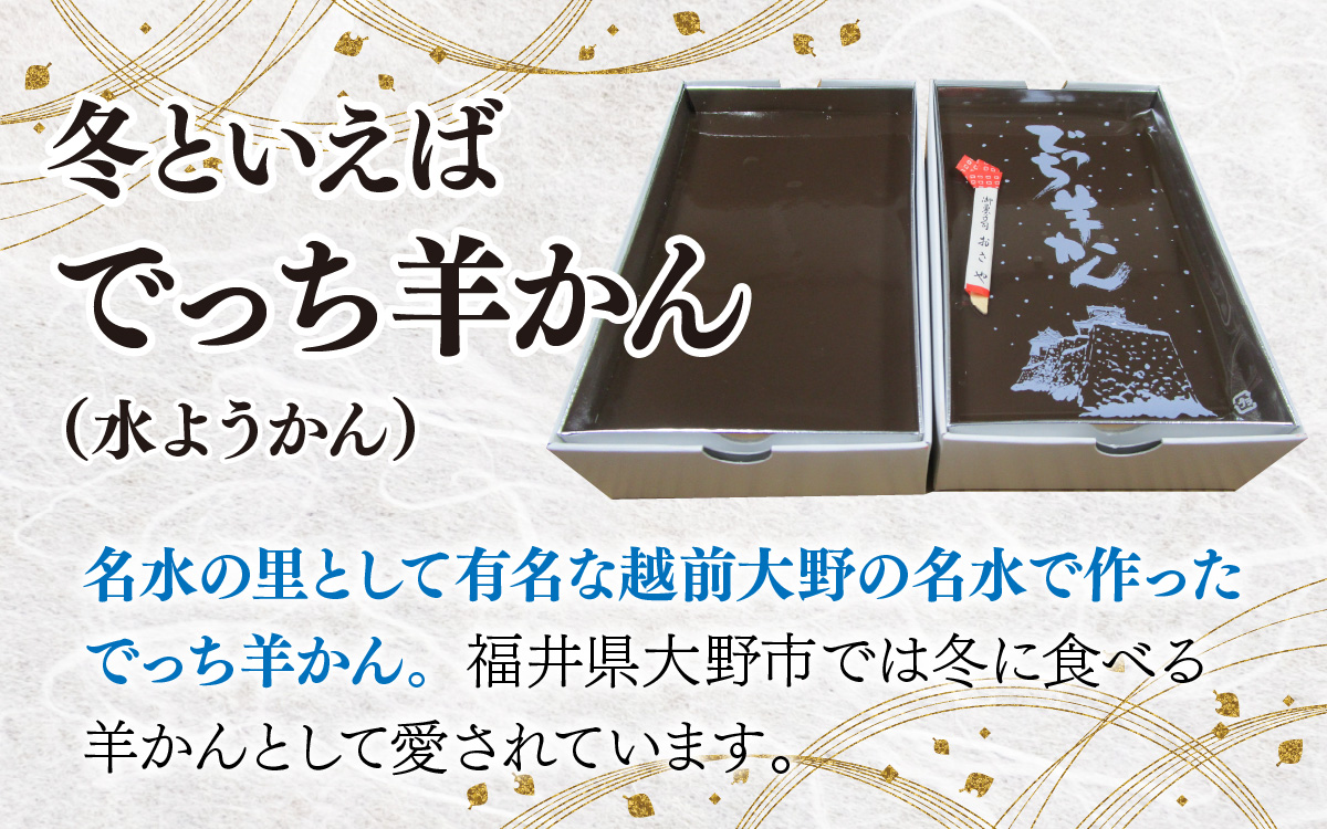 菓子屋の丁稚さんが正月に帰省する際、安くて美味しい水羊羹を手土産に持ち帰ったことに始まると伝えられています。そのでっち羊かんの発祥の地はこの越前大野とも言われ、この地方では今も昔も寒い冬に欠かせない楽しみの一つです。