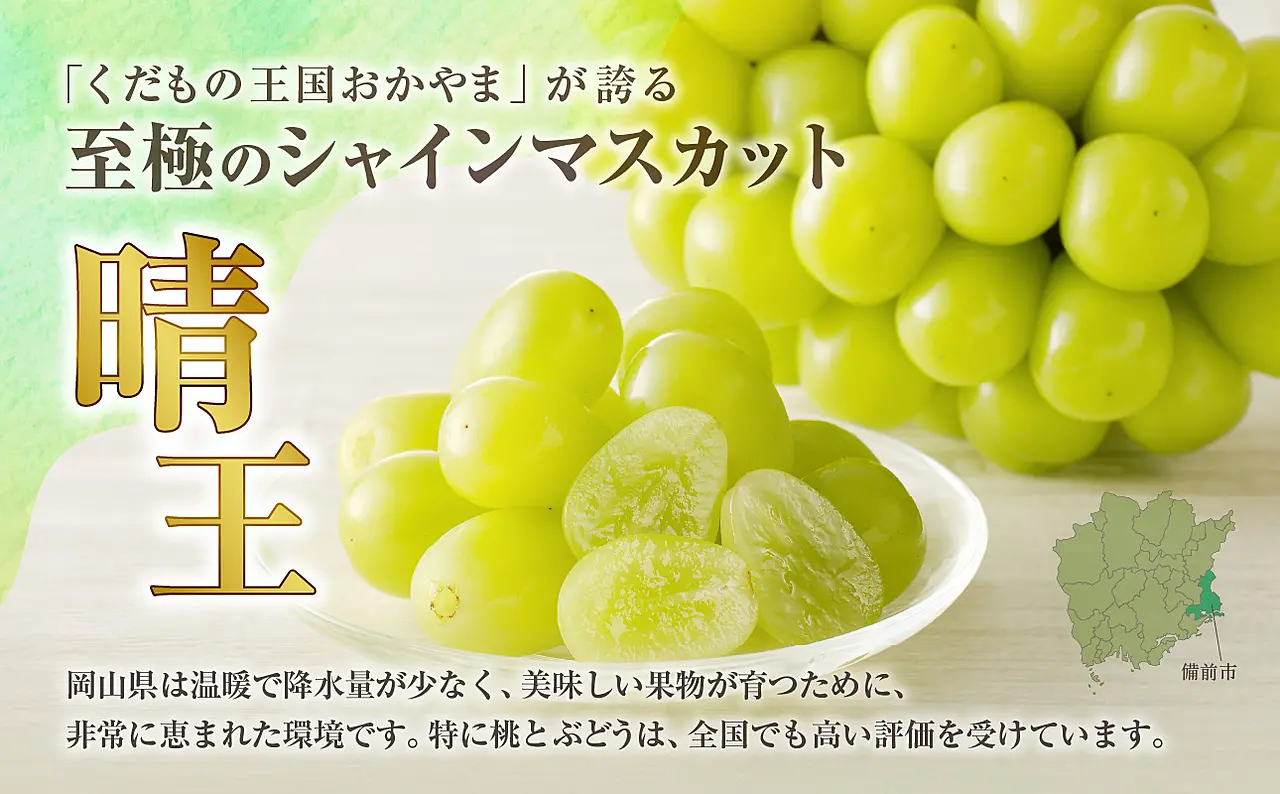 晴れの国おかやまで育ったシャインマスカット(晴王)をぜひご賞味ください。