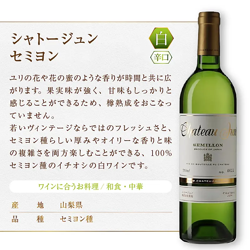 南アルプス市と甲州市において栽培されている香りと味の複雑さを楽しめるセミヨン種。