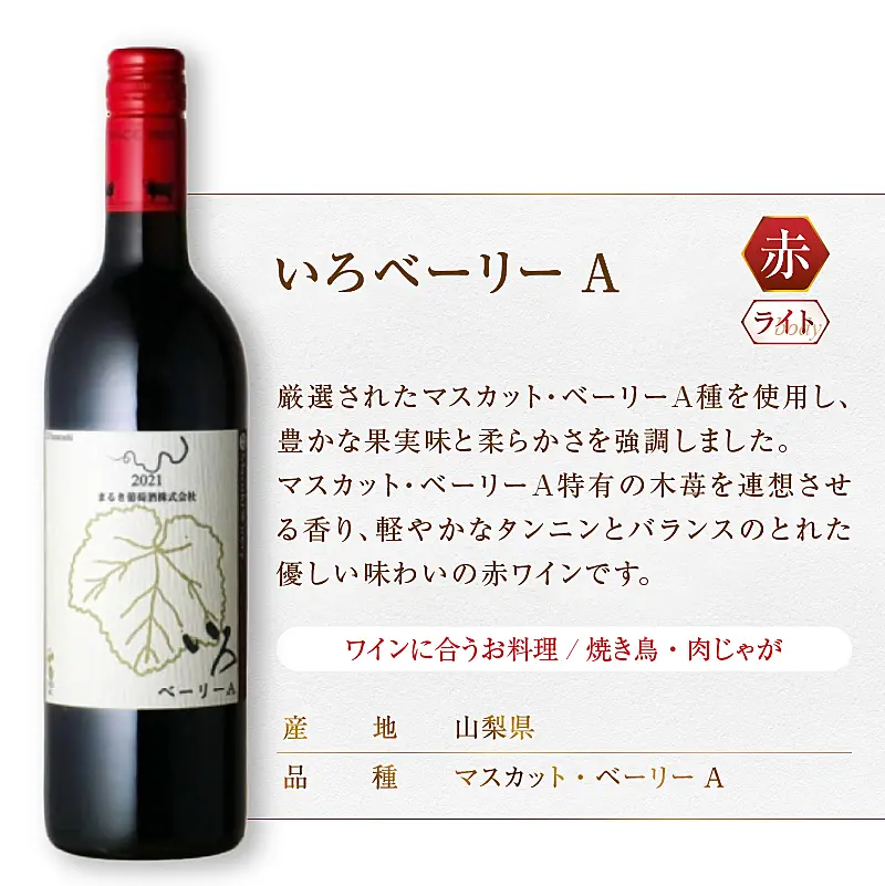 特徴:厳選されたマスカットベーリーA種を使用し、豊かな果実味と柔らかさを強調しました。