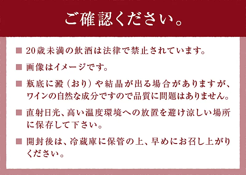 ※ワインの成分が沈殿することがありますが、品質には問題ございません。安心してお飲みください。