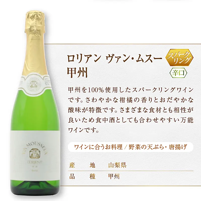 特徴:甲州を100%使用したスパークリングワインです。さわやかな柑橘の香りとおだやかな酸味が特徴です。さまざまな食材とも相性が良いため食中酒としても合わせやすい万能ワインです。