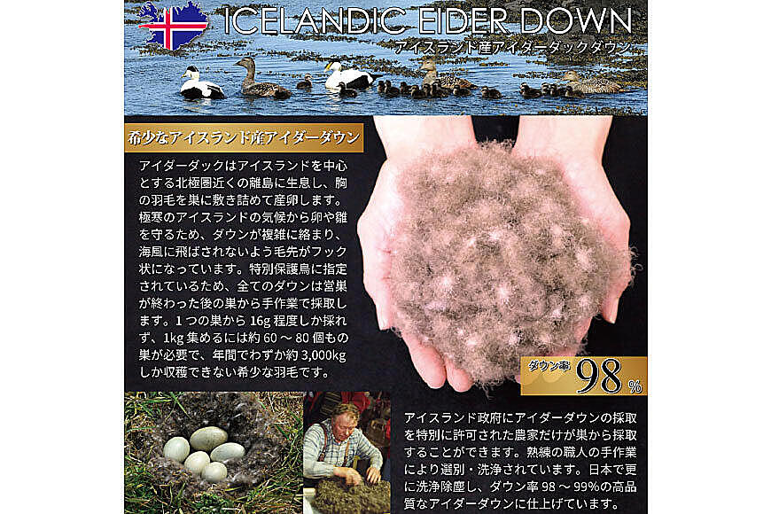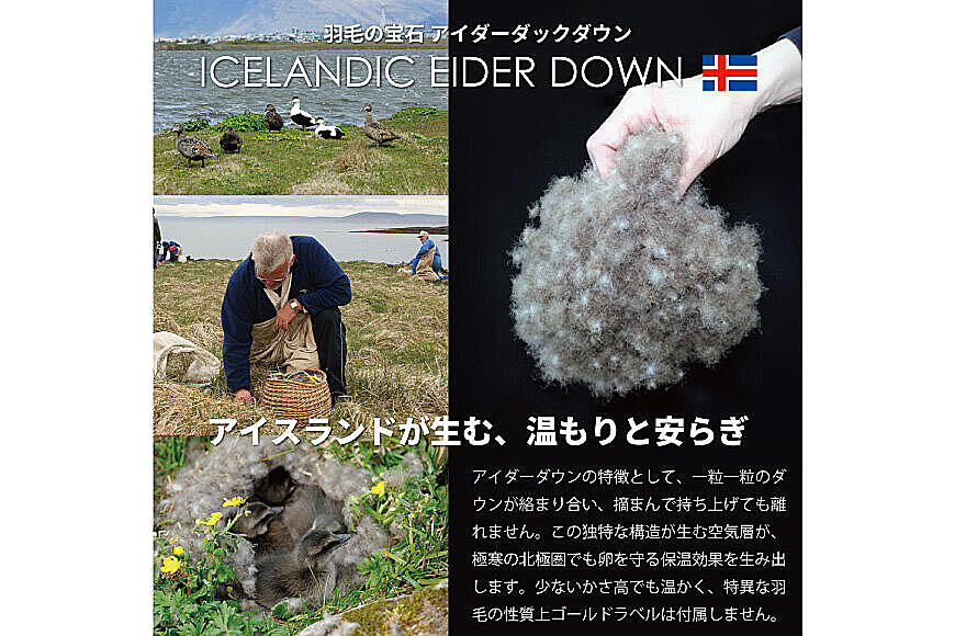 アイスランド政府から特別に許可を受けた農家が収穫したアイダーダウンを使用。