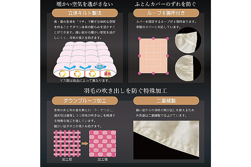 ※羽毛布団の特性上、縫い目や側生地からごく微量の羽毛が出てくることがありますが使用上問題はありません。