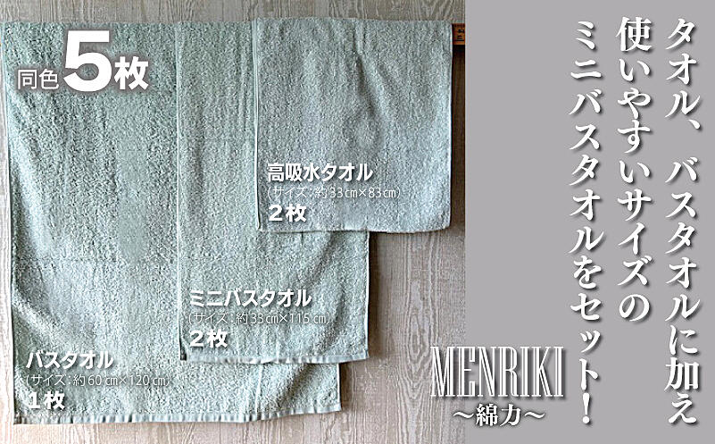 010B1442 ~MENRIKI~高吸水タオル・ミニバスタオル・バスタオル 5枚セット!(アクア) 泉州タオル