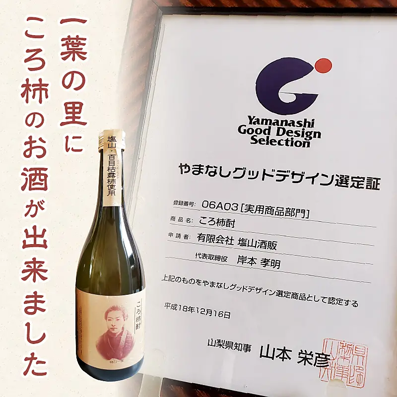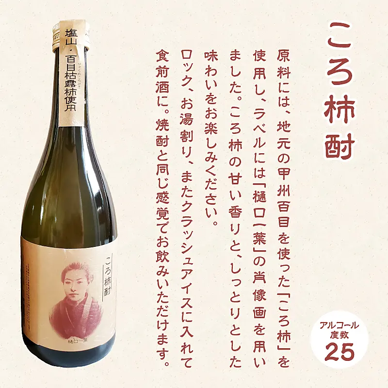 樋口一葉の生家がある甲州市に、このまちの特産品である「ころ柿」を使ったお酒が誕生しました。行政、商工会の協力の下、原料には、地元の甲州百目を使った「ころ柿」を使用しラベルには「樋口一葉」の肖像画を用いました。「ころ柿」の甘い香りと、しっとりとした味わいをお楽しみください。好みに合わせて、ロック、お湯割り、また、クラッシュアイスに入れて食前酒に。 アルコール度数25度のリキュールです。焼酎と同じ感覚でお飲みいただけます。
