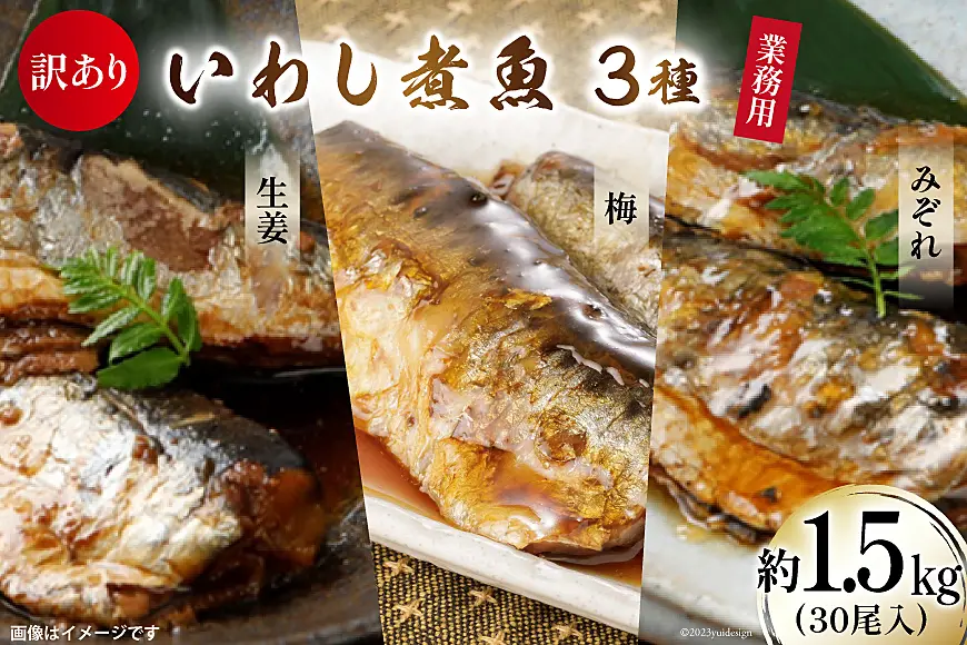 訳あり 業務用 いわし煮魚 3種×10尾 計30尾入 約1.5kg 簡易包装 [カネダイ 宮城県 気仙沼市 20565562]