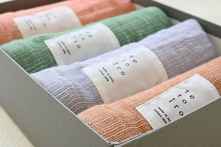 099H3326 特殊織ガーゼ ハンドタオル4枚とA5サイズの収納箱入り(オレンジ/パープル/グリーン/ブラウン)