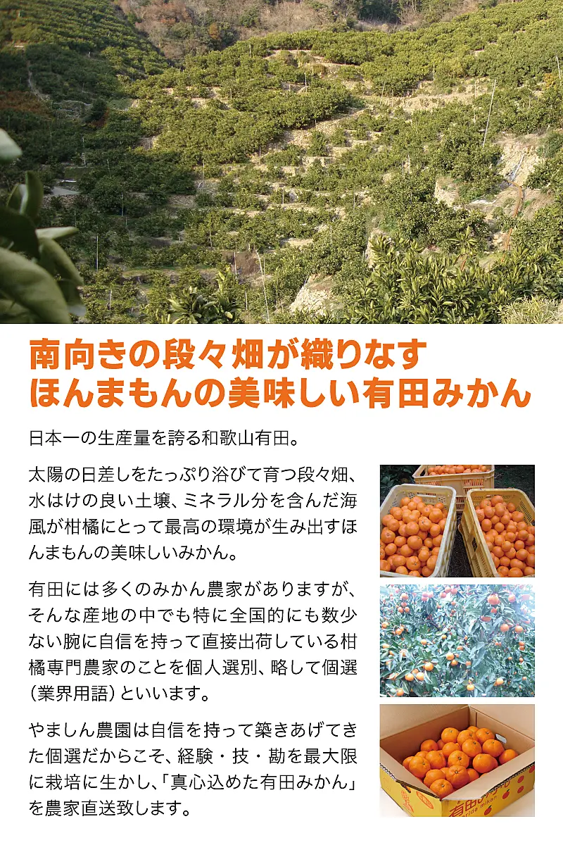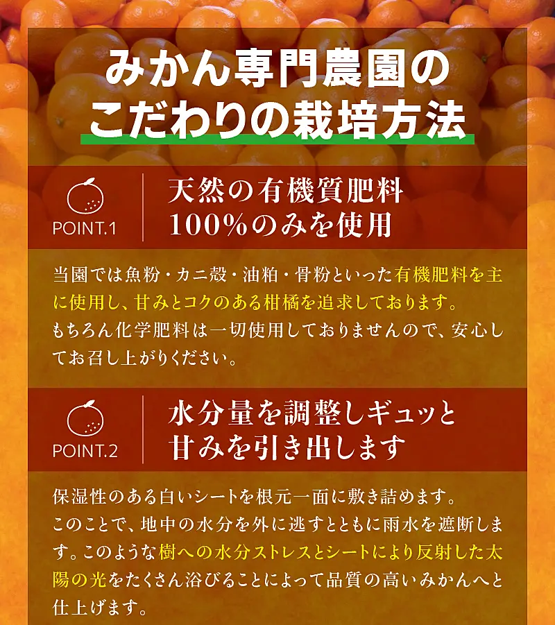 魚粉・カニ柄・油粕・骨紛といった有機肥料を主に使用し、甘みとコクのある柑橘を追求しております。