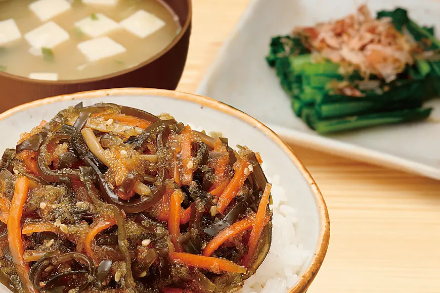 いかとめかぶを旨味しょう油ダレで味付けしました。