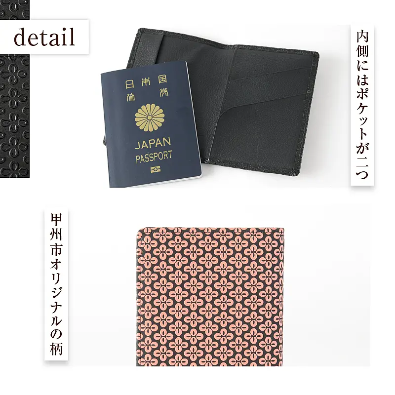 デザイン柄の市章は、武田菱と光に輝く葡萄の実を表現しており、甲州市オリジナル柄が引き立てます。内ポケットが2つついており、航空チケットなどを収納できます。